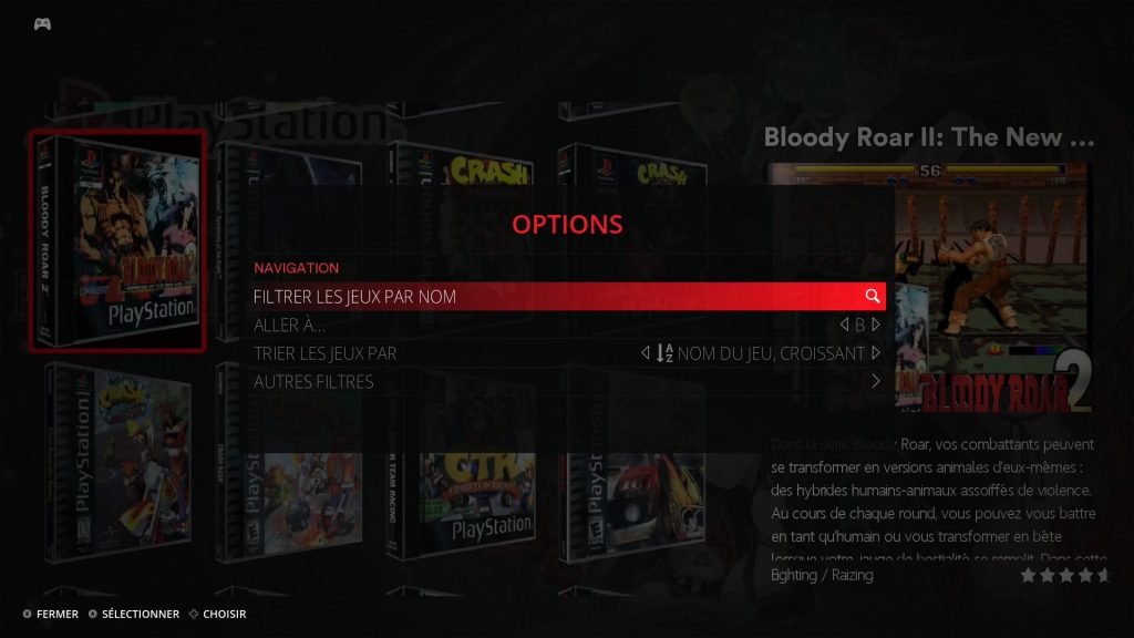 Rechercher des jeux : L’option de recherche vous facilitera la vie afin que vous puissiez rechercher vos jeux préférées grâce à ses nombreuses options et filtres. Pour accéder au menu de recherche lorsque vous aurez sélectionné la console de votre choix appuyer sur la touche « SELECT » de votre manette. Outre le fait de pouvoir rechercher vos jeux par nom des dizaines d’options de recherches s’offrent a vous, vous pourrez triez les jeux par genre, éditeur, notation…